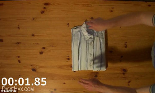 అక్కడికే వస్తున్నాం.. సాధారణంగా మీరు మీ చొక్కాను ఎంత సేపులో మడత పెట్టగలరు ఓ రెండు నిమిషాలు పడతుతందా..?, ఈ ఫోటోలోని కుర్రవాడు ‘డేవ్ హ్యాక్స్' మాత్రం చొక్కాలను రెండు సెకన్లలో మడత పెట్టేస్తున్నాడు. నమ్మశక్యం కావటం లేదు కదూ. అయితే క్రింది దృశ్యాలను చూడండి...