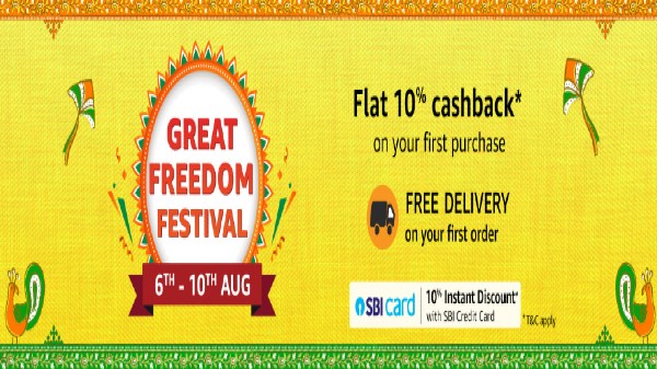 ప్రముఖ ఈ కామర్స్ సంస్థ అమెజాన్ తన యొక్క వెబ్ సైట్ లో ప్రస్తుతం గ్రేట్ ఫ్రీడమ్ ఫెస్టివల్ సేల్స్ ని నిర్వహిస్తోంది. స్వాతంత్ర్య దినోత్సవం సందర్భంగా నిర్వహించే ఈ ప్రత్యేకమైన ఆన్లైన్ సేల్స్ ఆగస్టు 6 నుండి మొదలయ్యి ఆగస్టు 10 వరకు నిర్వహించనున్నది. ప్రస్తుత అమెజాన్ గ్రేట్ ఫ్రీడమ్ ఫెస్టివల్ సేల్స్ సమయంలో స్మార్ట్ఫోన్లు, ల్యాప్టాప్లు మరియు ఇతర ఎలక్ట్రానిక్స్ పరికరాలపై అధిక మొత్తంలో డిస్కౌంట్లను అందిస్తున్నది.