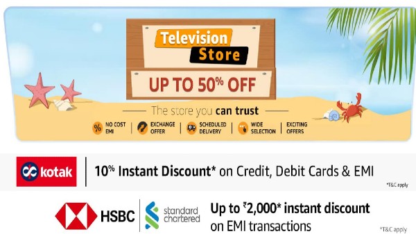 ప్రముఖ ఇ-కామర్స్ దిగ్గజం అమెజాన్ లో ప్రస్తుతం నిర్వహిస్తున్న టెలివిషన్ స్టోర్ లో స్మార్ట్టీవీలను కొనుగోలు మీద 50% వరకు డిస్కౌంట్ ఆఫర్లను అందిస్తుంది. OTTల వినియోగం అధికమవ్వడంతో కొత్త కొత్త సినిమాలు కూడా రిలీజ్ అయిన నెల లోపు OTT లలో అందుబాటులోకి వస్తున్నాయి. వీటిని సినిమా హాలులో గల సౌండ్ అనుభవంతో దానికి సమానంగా అదే తరహాలో కొన్ని స్మార్ట్టీవీలు అందిస్తున్నాయి. ఆన్లైన్ పద్దతిలో ఇటువంటి స్మార్ట్టీవీలను పొందాలనుకునే యూజర్లకు అమెజాన్ సరైన స్థలం.