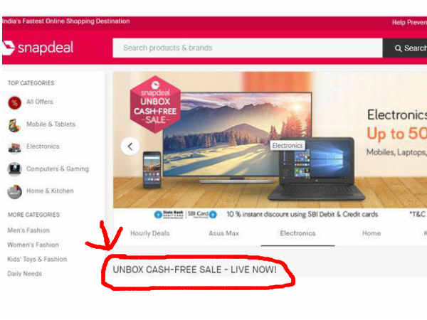 ఈ కామర్స్ మార్కెట్లో దూసుకుపోతున్న ప్రముఖ ఆన్లైన్ రిటైలర్ స్నాప్డీల్ తమ వినియోగదారుల ముందుకు అన్బాక్స్ కాష్ సేల్ పేరిట కొత్త ఆఫర్ని తీసుకొచ్చింది. ఈ ఆఫర్ లో భాగంగా ఎంపిక చేసిన వస్తువలపై 70 శాతం వరకు డిస్కౌంట్ ప్రకటించింది. ఈ ఆఫర్ నేటితో ముగియనుంది. ఈ ఆఫర్ ని ఉపయోగించుకొని ఎస్బీఐ డెబిట్ / క్రెడిట్ కార్డుల ద్వారా చెల్లింపులు చేస్తే అదనంగా మరో 10 శాతం డిస్కౌంట్ను కూడా ఇచ్చింది. ఈ రోజు వరకు తమ స్నాప్డీల్ వెబ్సైట్, మొబైల్ యాప్ రెండింటిలో అందుబాటులో ఉంటుందని ఆ సంస్థ పేర్కొంది.