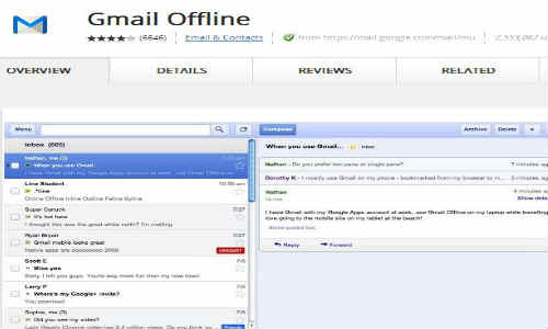 ఇంటర్నెట్ కనెక్షన్ లేకుండా జీమెయిల్లోని వివరాలు చూడొచ్చా..? సాధ్యమే అంటోంది జీమెయిల్ ఆఫ్లైన్ అప్లికేషన్. ఈ ఫీచర్ను ఉపయోగించుకోవాలనుకునే యూజర్ తప్పని సరిగా గూగుల్ క్రోమ్ బ్రౌజర్ను తన పీసీ లేదా ల్యాప్టాప్లో ఇన్స్స్టాల్ చేసుకోవాలి. ఇన్సస్టాలేషన్ అనంతరం క్రోమ్ వెబ్ స్టోర్లోకి లాగినై జీమెయిల్ ఆఫ్లైన్ అప్లికేషన్ను డౌన్లోడ్ చేసుకోవాలి. మీరు డౌన్లోడ్ చేసిన సదరు అప్లికేషన్ గూగుల్ క్రోమ్ అప్లికేషన్ పేజీలో నిక్షిప్తం కాబడి ఉంటుంది.