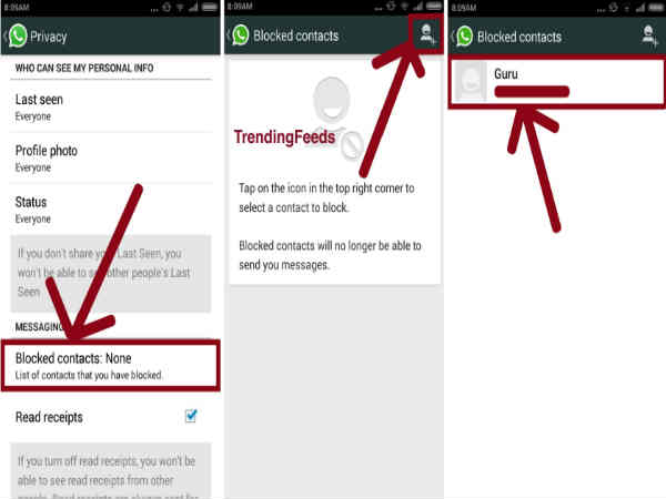 వాట్సప్ ఈ యాప్ లేని ఆండ్రాయిడ్ ఫోన్ ఈ రోజుల్లో ఉండదంటే అతిశయోక్తి కాదు. యూజర్లను ఇట్టే కట్టిపడేస్తున్న ఈ యాప్ వాడే వారి సంఖ్య రోజురోజుకు పెరిగిపోతుందే కాని తగ్గడం లేదు. అయితే ఇది ఒక్కోసారి చికాకు పరిచే అవకాశం కూడా ఉంది. అందుకే కొంతమంది నచ్చనివారిని బ్లాక్ చేసేస్తుంటారు.అయితే అలా బ్లాక్ చేసిన వారిని తెలుసుకోవడం ఎలా అనే విషయం చాలామందికి తెలియదు. అలాంటి వారి కోసం కొన్ని ట్రిక్స్ ఇస్తున్నాం వీటిని ఫాలో కావడం ద్వారా మీరు ఆటోమేటిగ్గా తెలుసుకోవచ్చు.