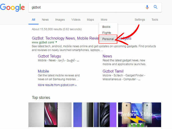 ఈ పర్సనల్ సెర్చ్ methodను మీరు ట్రై చేయాలనుకుంటున్నట్లయితే ముందుగా మీ సొంత అకౌంట్ నుంచి గూగుల్ పేజీలోకి లాగిన్ కావల్సి ఉంటుంది. లాగిన్ అయిన తరువాత గూగుల్ సెర్చ్ పేజీలోని More ఆప్షన్ పై క్లిక్ చేసినట్లయితే బుక్స్, ఫ్లైట్స్ ఆప్షన్స్ క్రింద Personal అనే ఆప్షన్ కనిపిస్తుంది. ఈ ఆప్షన్ పై క్లిక్ చేసినట్లయితే మీ జీమెయిల్ ఇంకా గూగుల్ ఫోటోస్లోని పర్సనల్ కంటెంట్ ను కీవర్డ్స్ ఆధారంగా బ్రౌజ్ చేసుకునే వీలుంటుంది.