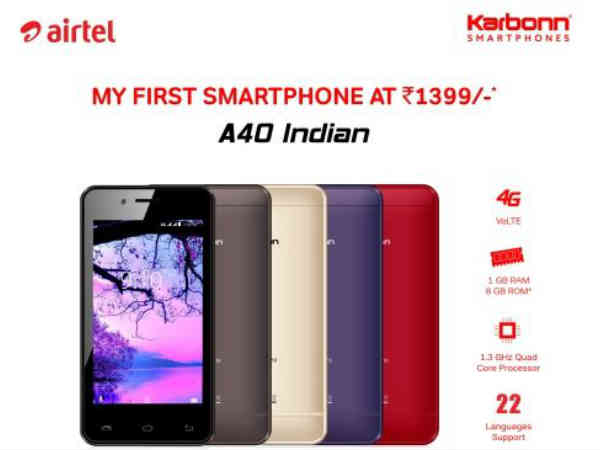 Karbonn A40 Indian ధర ఇంతకుముందు రూ. 3279గా ఉంది. ఫ్లిప్కార్ట్లో ఇది విక్రయానికి ఉంది. అయితే ఎయిర్టెల్ కొన్నిపరిమితులతో దీన్ని అందుబాటులోకి తీసుకొస్తోంది. ఇప్పుడు దీని ధరను రూ. 1399గా నిర్ణయించింది.