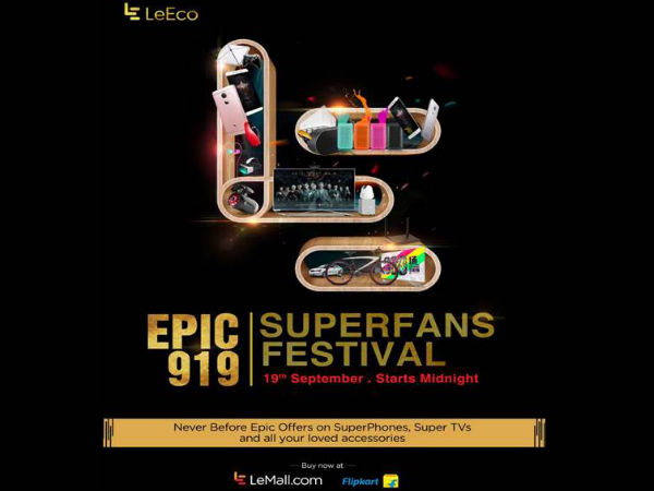 గ్లోబల్ టెక్నాలజీ కంపెనీ LeEco తనదైన స్టైల్లో EPIC 919 SuperFan ఫెస్టివల్ను భారత్లో లాంచ్ చేసింది. లీఇకో సూపర్ ఫోన్స్ అలానే సూపర్ టీవీల పై కనీవినీ డిస్కౌంట్లతో సెప్టంబర్ 19, 2016 అర్థరాత్రి నుంచి ప్రారంభమైన ఈ అతిపెద్ద ఆన్లైన్ షాపింగ్ సేల్ను LeMall.com అలానే Flipkartలు ఎక్స్క్లూజివ్గా నిర్వహిస్తున్నాయి.