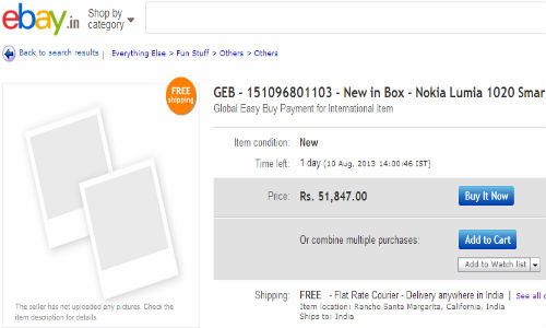 నోకియా కొత్త మోడల్ స్మార్ట్ఫోన్ ‘లూమియా 1020'ను కొనుగోలు చేసేందకు అనేకమంది భారతీయ వినియోగదారులు సిద్ధంగా ఉన్నారు. అయితే, ఇండియన్ మార్కెట్లో లూమియా 1020 విడుదలకు సంబంధించి నోకియా ఇప్పటి వరకు అధికారిక ప్రకటనను వెలవరించలేదు. ఈ నేపధ్యంలో గిజ్బాట్ ఆసక్తికరమైన సమాచారాన్ని సేకరించింది. దేశంలోని ప్రముఖ ఆన్లైన్ రిటైలర్లలో ఒకటైన ఈబేఇండియా (ebay India) నోకియా లూమియా 1020 మోడల్ వివరాలను తన లిస్టింగ్స్లో పేర్కొంది. ఈ రిటైలింగ్ దిగ్గజం లూమియా 1020 ధరను రూ. 51,847గా తన లిస్టింగ్స్లో పేర్కొంది.