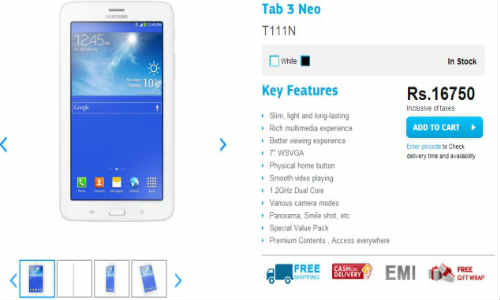 దక్షిణ కొరియాకు చెందిన ప్రముఖ స్మార్ట్ఫోన్ల తయారీ కంపెనీ సామ్సంగ్ ఇటీవల ఆవిష్కరించిన ట్యాబ్లెట్ కంప్యూటర్ గెలాక్సీ ట్యాబ్ 3 నియో ఇప్పుడు ఇండియన్ మార్కెట్లో అధికారికంగా లభ్యమవుతోంది. సామ్ సంగ్ అధికారిక ఆన్ లైన్ స్టోర్ గెలాక్సీ ట్యాబ్ 3 నియో ట్యాబ్లెట్ (3జీ మోడల్)ను రూ.16750కి విక్రయిస్తోంది.