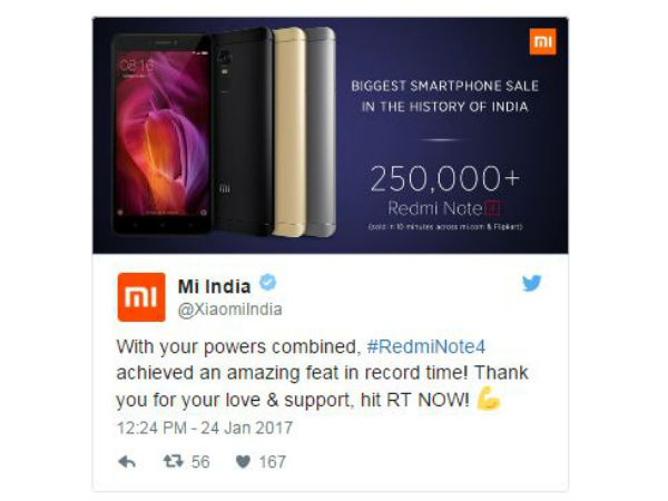 10 నిమిషాల పాటు జరిగిన ఈ సేల్లో భాగంగా మొత్తం 2,50,000 రెడ్మీ నోట్ 4 యూనిట్లు అమ్ముడైనట్లు XiaomiIndia తన అధికారిక ట్విట్టర్ అకౌంట్ ద్వారా పేర్కొంది.
