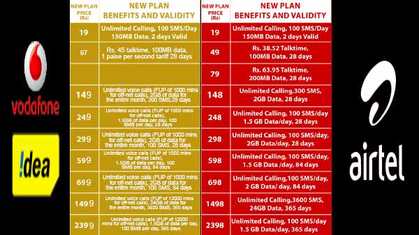 ఎయిర్టెల్ యొక్క రూ.598 ప్లాన్ 84 రోజుల వాలిడిటీతో వస్తుంది. మిగిలిన అదనపు ప్రయోజనాలలో అపరిమిత కాలింగ్, 1.5GB రోజువారీ డేటా మరియు రోజుకు 100 SMSలు ఉన్నాయి. మరోవైపు వోడాఫోన్ ఐడియా యొక్క రూ.599 టారిఫ్ ప్లాన్ 84 రోజుల వాలిడిటీతో వస్తుంది.ఇది అపరిమిత వాయిస్ కాల్స్ (ఆఫ్-నెట్ కాల్స్ కోసం 3,000 నిమిషాల FUP), రోజుకు 1.5GB డేటా మరియు రోజుకు 100 SMSల ప్రయోజనాలను అందిస్తుంది.