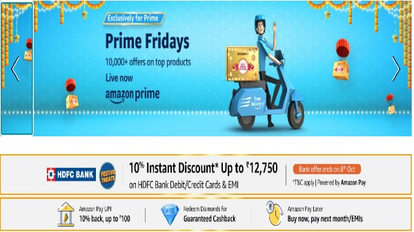 అమెజాన్ ఇండియాలో ప్రస్తుతం జరుగుతున్న గ్రేట్ ఇండియన్ ఫెస్టివల్ సేల్ లో అమెజాన్ ప్రైమ్ మెంబర్ల కోసం ప్రతి శుక్రవారం ప్రత్యేక ఆఫర్లను అందిస్తున్నట్లు ప్రకటించింది. ఈ అమెజాన్ గ్రేట్ ఇండియన్ ఫెస్టివల్ సేల్స్ ఈ సంవత్సరం అక్టోబర్ 2 న ప్రారంభమైంది. మునుపటి సంవత్సరాల మాదిరిగానే ఈ సేల్స్ ఈ సంవత్సరం నవంబర్ 4 దీపావళి వరకు కొనసాగుతుందని భావిస్తున్నారు.