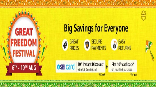 ఒకవేళ మీరు గత నెలలో అమెజాన్ ప్రైమ్ డే సేల్లో ఏవైనా వస్తువులను కొనుగోలు చేయడం మిస్ అయితే కనుక అమెజాన్ గ్రేట్ ఫ్రీడమ్ ఫెస్టివల్ సేల్స్ సమయంలో టెక్నాలజీకి సంబందించిన కొన్ని ఉత్పత్తులను తగ్గింపు ధరలలో పొందేందుకు గొప్ప అవకాశంగా ఉంటుంది. ఈ సేల్ సమయంలో అమెజాన్ తన కార్డ్ హోల్డర్లకు 10 శాతం తక్షణ తగ్గింపును అందించడానికి SBI కార్డ్లతో జతకట్టింది కావున SBI కార్డులను కలిగిఉన్న వారు డిస్కౌంట్లను పొందవచ్చు.