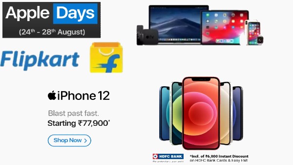 ఫ్లిప్కార్ట్లో ఆపిల్ డేస్ సేల్స్ మరొకసారి ప్రారంభం అయ్యాయి. ఆగష్టు 24 నుంచి ఆగష్టు 28 మధ్య జరిగే నాలుగు రోజుల అమ్మకంలో ఐఫోన్లపై మరియు మాక్ మరియు ఆపిల్ వాచ్ల కొనుగోలు మీద అధిక మొత్తంలో భారీ డిస్కౌంట్లను మరియు డీల్లను అందిస్తుంది. ఆపిల్ డేస్ సేల్ మంగళవారం ప్రారంభమైంది మరియు శనివారం అంటే ఆగష్టు 28, 2021 న ముగుస్తుంది. ఐఫోన్ 12 మినీ లేదా ఐఫోన్ 12 ప్రో మ్యాక్స్ వంటి వాటిని మీ యొక్క చేతులలో పొందడానికి ఎదురుచూస్తుంటే కనుక ఫ్లిప్కార్ట్ యొక్క తాజా అమ్మకం మీకు సరైన ఎంపిక కావచ్చు. దీని గురించి మరిన్ని వివరాలు తెలుసుకోవడానికి ముందుకు చదవండి.