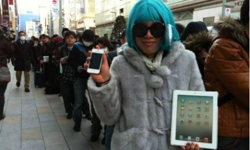 ఇంకా చెప్పాలంటే జపాన్లో ఆపిల్ ఉత్పత్తులకు ఉన్న గిరాకీ, డిమాండ్ మరే ఏదేశంలో ఉండదు. 'ఆపిల్ న్యూ ఐప్యాడ్' ని తామే మందుగా సొంతం చేసుకోవాలన్న వారి తపనను చూస్తుంటే ముచ్చట వేస్తుంది. ఇక ఆపిల్ స్టోర్ ప్రతినిధులు మాట్లాడుతూ గతంలో ఆపిల్ విడుదల చేసిన తర్వాత ఐఫోన్ 4ఎస్ తర్వాత పెద్ద ఎత్తున అభిమానులు ఇప్పుడేనని అన్నారు. ఆపిల్ ఐఫోన్ 4ఎస్ విడుదలై జపాన్ మొబైల్ మార్కెట్లో నెంబర్ వన్ కలెక్షన్స్ వసూలు చేయడమే కాకుండా.. రికార్డు స్దాయి అమ్మకాలు నమోదు చేసింది.