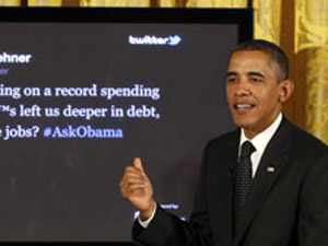అందుకు కారణం మిగిలిన ప్రశ్నలకు చెప్పేసమాధానం ట్విట్టర్లో చెప్పలేకపోవడమేనని తెలియజేశారు. ఈ సందర్బంలో బరాక్ ఒబామా మాట్లాడుతూ నాకు తెలుసు, నేను చెప్పవలసిన సమాధానాలు చాలా చిన్నవిగా ఉండాలి. అందుకే ఇందులో కేవలం కొన్నింటికి మాత్రమే సమాధానం చెబుతున్నానని అన్నారు. ఒహాయో స్పీకర్ జాన్ బోహ్నెర్ అడిగిన ప్రశ్నకు ‘వైట్హౌస్’లో బుధవారం లైవ్ వెబ్కాస్ట్ ద్వారా సమాధానం ఇస్తున్న అమెరికా అధ్యక్షుడు బరాక్ ఒబామాని మీరు ఈ ప్రక్క చిత్రంలో చూడవచ్చు.