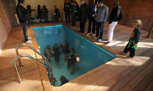 వాస్తవానికి ఈ స్విమ్మింగ్ పూల్ నకిలీది. కొలన పై భాగంలో (4 నుంచి 5 అంగుళాల క్రింద) ఓ ప్రత్యేకమైన ట్రాన్స్పరెంట్ గ్లాస్ను ఏర్పాటు చేసి గ్లాస్ పై నీరు నిలిచే విధంగా చర్యలు తీసుకున్నారు. పూల్ క్రింది భాగాన్ని పూర్తిగా ఖాళీగా ఉంచి సందర్శకులులోనికి ప్రవేశించే విధంగా ద్వారాన్ని ఏర్పాటు చేసారు. ఈ స్విమ్మింగ్ పూల్ను బయట నుంచి వీక్షించే వారికి విచిత్రమైన భ్రమలు కలుగుతాయి. కనాజ్వాలోని 21 సెంచురీ మ్యూజియం ఆఫ్ ఆర్ట్లో ఈ నకిలీ ఈత కొలనును ప్రదర్శనకు ఉంచారు.