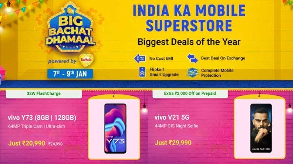 ఫ్లిప్కార్ట్ బిగ్ బచత్ ధమాల్ సేల్ వివో స్మార్ట్ఫోన్లపై తగ్గింపు ఒప్పందాన్ని కూడా పొడిగిస్తోంది. రూ.29,990కే Vivo V21 5Gని మీరు కొనుగోలు చేయవచ్చు. అదేవిధంగా, Vivo X70 Pro మరియు Vivo Y73 ఇప్పుడు రూ. 52,990 మరియు రూ. 20,990. లకు పొందవచ్చు . ఇది కాకుండా, ఫ్లిప్కార్ట్ బిగ్ బచత్ ధమాల్ సేల్ ఐఫోన్ 12 మరియు ఐఫోన్ 12 మినీలను కూడా తగ్గింపు ధరతో అందిస్తోంది. Oppo Reno6 Pro మరియు Google Pixel 4aని కూడా ఆఫర్లలో చూడవచ్చు.