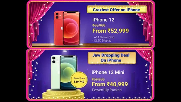ఫ్లిప్కార్ట్ బిగ్ బిలియన్ డేస్ నవరాత్రి ఆఫర్లలో ఆపిల్ ఐఫోన్ 12 మినీ ఫోన్ పై 31% తగ్గింపు లభిస్తుంది. మీరు ఈ స్మార్ట్ఫోన్ను ఈ అమ్మకం సమయంలో రూ.40,999 కు కొనుగోలు చేయవచ్చు.ఐఫోన్ 12 మోడళ్ల లోని ఇతర ఫోన్ల మాదిరిగానే శక్తిని మరియు పనితీరును తీసుకువచ్చింది. అంతే కాక, ఆపిల్ నుంచి వచ్చిన చిన్న మరియు తక్కువ ధర కలిగిన 5G ఫోన్ ఇది.