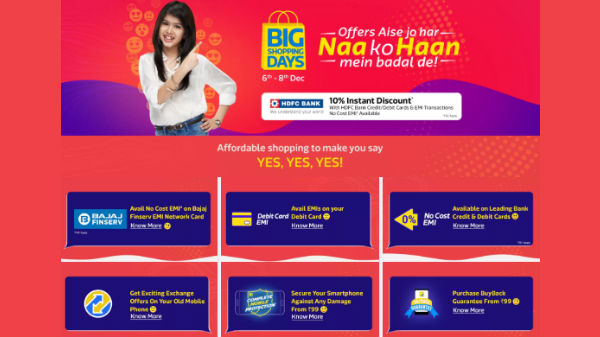 ఈ కామర్స్ దిగ్గజం ప్లిఫ్కార్ట్ వినియోగదారుల కోసం డిసెంబర్ 6 నుంచి 8 వరకు మూడు రోజుల పాటు బిగ్ షాపింగ్ డేస్ పేరిట ప్రత్యేక ఇయర్ ఎండింగ్ సేల్ను నిర్వహిస్తున్నది. ఈ మూడు రోజులు సేల్లో భాగంగా మొబైల్స్, ట్యాబ్లెట్స్, ఎలక్ట్రానిక్స్, యాక్ససరీలు, ఫ్యాషన్, లైఫ్ స్టైల్, టీవీలు, హోమ్ అప్లయెన్సెస్, ఫర్నిచర్ ఉత్పత్తులపై పలు డిస్కౌంట్లను కంపెనీ ప్రకటిస్తోంది.