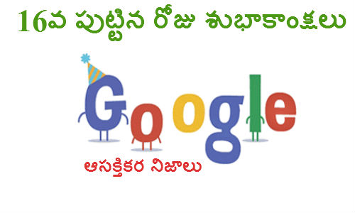 సెర్చ్ ఇంజన్ గూగుల్ తన 16వ పుట్టిన రోజును శనివారం (సెప్టంబర్ 27)న ఘనంగా జరుపుకుంటోంది. ఈ సందర్భాన్ని పురస్కరించుకుని గూగుల్ తన హోమ్ పేజీ పై ఆసక్తికర పుట్టినరోజు డూడుల్ను అప్లోడ్ చేసింది. 2005 వరకు గూగుల్ తన పుట్టినరోజును సెప్టంబర్ 7న జరుపుకునేది. న్యాయపరమైన కారణావల్ల ఆ తేదీని సెప్టంబర్ 27కు మార్చారు. సెర్చ్ ఇంజన్ గూగుల్ మరిన్ని పుట్టిరోజులను జరుపుకోవాలని మనస్ఫూర్తిగా ఆకాంక్షిద్దాం. గూగుల్ 16వ పుట్టిన రోజు సందర్భాన్ని పురస్కరించుకుని పలు ఆసక్తికర వాస్తవాలు మీకోసం...