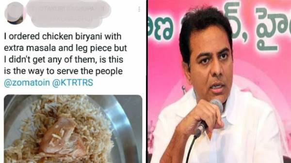 అయితే, శుక్రవారం, తోటకూరి రఘుపతి అనే ట్విట్టర్ యూజర్ ఒక విచిత్రమైన అభ్యర్థనతో మంత్రికి ట్వీట్ చేశాడు. తాను ఆర్డర్ చేసిన హైదరాబాదీ బిర్యానీపై చాలా విసుగు చెందిన రఘుపతి, జోమాటో మరియు కెటి రామారావు గారికి తన "దుస్థితి" గురించి ట్వీట్ చేశాడు.
