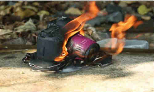 1.) మన్నిక పరీక్ష విఫలమవటంతో ప్రమాదంలో చిక్కుకుని అగ్నికి ఆహుతవుతున్న కానన్ ఈఓఎస్7డి డిజిటల్ సింగిల్ లెన్స్ కెమెరా.