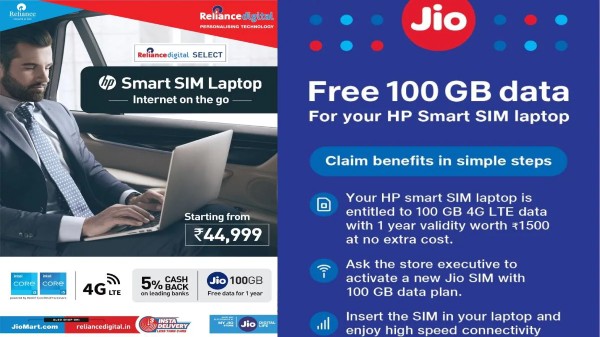 HP మరియు Jio సంస్థలు రెండు కలసి అందిస్తున్న ఈ ఆఫర్ ఎంపిక చేయబడిన కొత్త HP ల్యాప్టాప్లను కొనుగోలు చేసే కస్టమర్లకు మాత్రమే వర్తిస్తుంది. అర్హత కలిగిన HP LTE ల్యాప్టాప్తో జియో SIMకి సబ్స్క్రయిబ్ చేసుకోవడం ద్వారా ఎటువంటి అదనపు ఖర్చు లేకుండా 365 రోజుల చెల్లుబాటు కాలానికి (రూ.1500) 100GB డేటాను ఉచితంగా పొందవచ్చు. అర్హత గల HP ల్యాప్టాప్ మోడల్లలో HP 14ef1003tu మరియు HP 14ef1002tu వంటివి ఉన్నాయి. Jio - HP స్మార్ట్ సిమ్ ల్యాప్టాప్ ఆఫర్ను రిలయన్స్ డిజిటల్ స్టోర్లలో లేదా ఆన్లైన్లో reliancedigital.in లేదా JioMart.com ద్వారా అర్హత గల HP స్మార్ట్ ల్యాప్టాప్లను కొనుగోలు చేసిన వారు పొందవచ్చు.