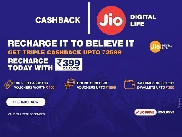 జియో ప్రైమ్ కస్టమర్లకు రిలయన్స్ జియో ఈ ప్రత్యేక ప్రయోజనాలను ప్రకటించింది. 2,599ప్రతి రీఛార్జ్ రూ.399లేదా అంతకంటే ఎక్కువ వారికి 300రూపాయల వరకు క్యాష్ బ్యాక్ లభిస్తుంది. 399ఆపైన విలువ గల ప్లాన్ను జియో యాప్ లేదా వెబ్ సైట్ ద్వారా రీఛార్జి చేసుకుంటే వారికి 400రూపాయల విలువ గల 8 ఓచర్లు లభిస్తాయి. క్యాష్ బ్యాక్ ఓచర్లు, అమెజాన్ పే, యాక్సిస్ పే, ప్రీ ఛార్జ్, మోబిక్విక్, పేటీఎం, ఫోన్ పే రీచార్జ్ చేసుకుంటే క్యాష్ బ్యాక్ అఫర్ లభిస్తుంది.