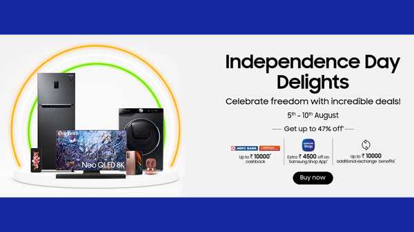 స్వతంత్ర దినోత్సవం కొద్ది రోజులే ఉంది మరియు అనేక ఆన్లైన్ రిటైలర్లు మరియు బ్రాండ్లు తమ డిస్కౌంట్లు మరియు ఆఫర్లను ప్రకటించడం ప్రారంభించాయి. విక్రయాన్ని ప్రకటించిన బ్రాండ్లలో ఒకటి శామ్సంగ్. Samsung Independence Day Delight Sale 2021 ఆగస్టు 5 నుండి ఆగస్టు 10 వరకు ప్రత్యక్ష ప్రసారం చేయబడుతుంది.
