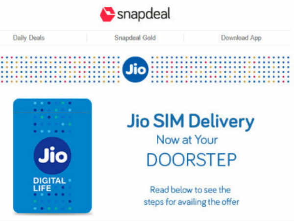 ఇప్పుడు జియో సిమ్ నేరుగా ఇంటికే తీసుకొచ్చేలా రిలయన్స్ సంస్థ ఈ కామర్స్ దిగ్గజం స్నాప్డీల్తో ఒప్పందం కుదుర్చుకున్నట్లు తెలుస్తోంది.