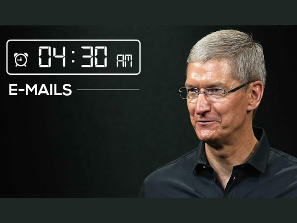 నాలుగన్నరకే లేచి మెయిల్స్ చెక్ చేసుకుంటారు. ఆపీసులోకి ఫస్ట్ ఎంటరయ్యేది టిమ్ కుక్నే అలాగే లాస్ట్న వెళ్లిపోయేది ఇతనే.