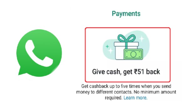 వాట్సాప్ తన UPI పేమెంట్ సర్వీసును ప్రాచుర్యంలోకి తీసుకురావడంలో కొత్త అడుగు వేసింది. దీనితో వాట్సాప్ వినియోగదారులకు గొప్ప క్యాష్బ్యాక్ను కూడా అందిస్తుంది. ప్రస్తుతం క్యాష్బ్యాక్ అందిస్తున్న ఫీచర్లు బీటా వినియోగదారులకు పరిచయం చేయబడుతున్నాయి. ఆండ్రాయిడ్ వాట్సాప్ బీటా యాప్ చాట్బార్ ఎగువన "నగదు ఇవ్వండి" ₹ 51 తిరిగి పొందండి అనే మెసేజ్ తో కూడిన బ్యానర్ను ప్రదర్శించడం ప్రారంభించింది.