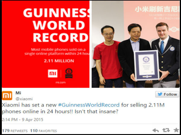 తాము 24 గంటల్లో 2.11 మిలియన్ల స్మార్ట్ఫోన్లను ఆన్లైన్ ద్వారా విక్రయించి అర సరికొత్త గిన్నీస్ వరల్డ్ రికార్డ్ను నెలకొల్పినట్లు చైనా స్మార్ట్ఫోన్ల కంపెనీ షియోమి గురువారం తెలిపింది. షియోమి 5వ వార్షికోత్సవాన్ని పురస్కరించుకుని మార్చి 8న నిర్వహించిన మైఫ్యాన్ ఫెస్టివల్లో భాగంగా ఈ ఫ్లాష్ సేల్ను నిర్వహించినట్లు షియోమి తెలిపింది.