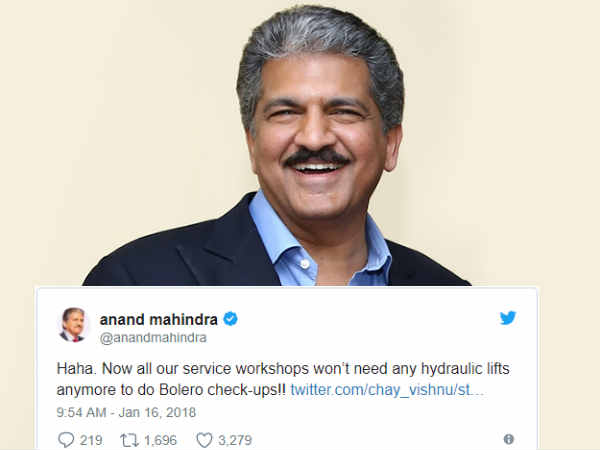 మా సర్వీసు వర్క్షాపుల్లో బొలొరో వాహనాన్ని లేపడానికి ఎటువంటి హైడ్రోలిక్ లిఫ్టులు అవసరం లేదని బాలకృష్ణ ఒక్కడే చాలని ఫన్నీగా ట్వీట్ చేశారు.